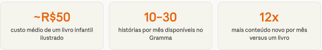 Com o preço de um único livro comprado na livraria, uma família pode ter acesso a um acervo gerado mensalmente, com histórias inéditas, personalizáveis e alinhadas com o que as crianças estão aprendendo. Não é comparação de preço — é comparação de valor entregue.